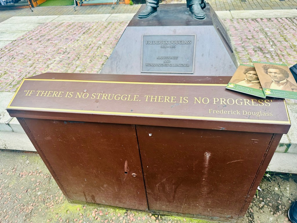 When we approach the statue I am immediately impressed. The statute features Douglass standing tall with broad shoulders and with his right arm lifted and right hand pointer finger pointing upwards toward the North Star. His left hand down on his side holding a broken chain. It is a regal statue and reminds you of the pain and the struggle, but also the triumph and legacy.